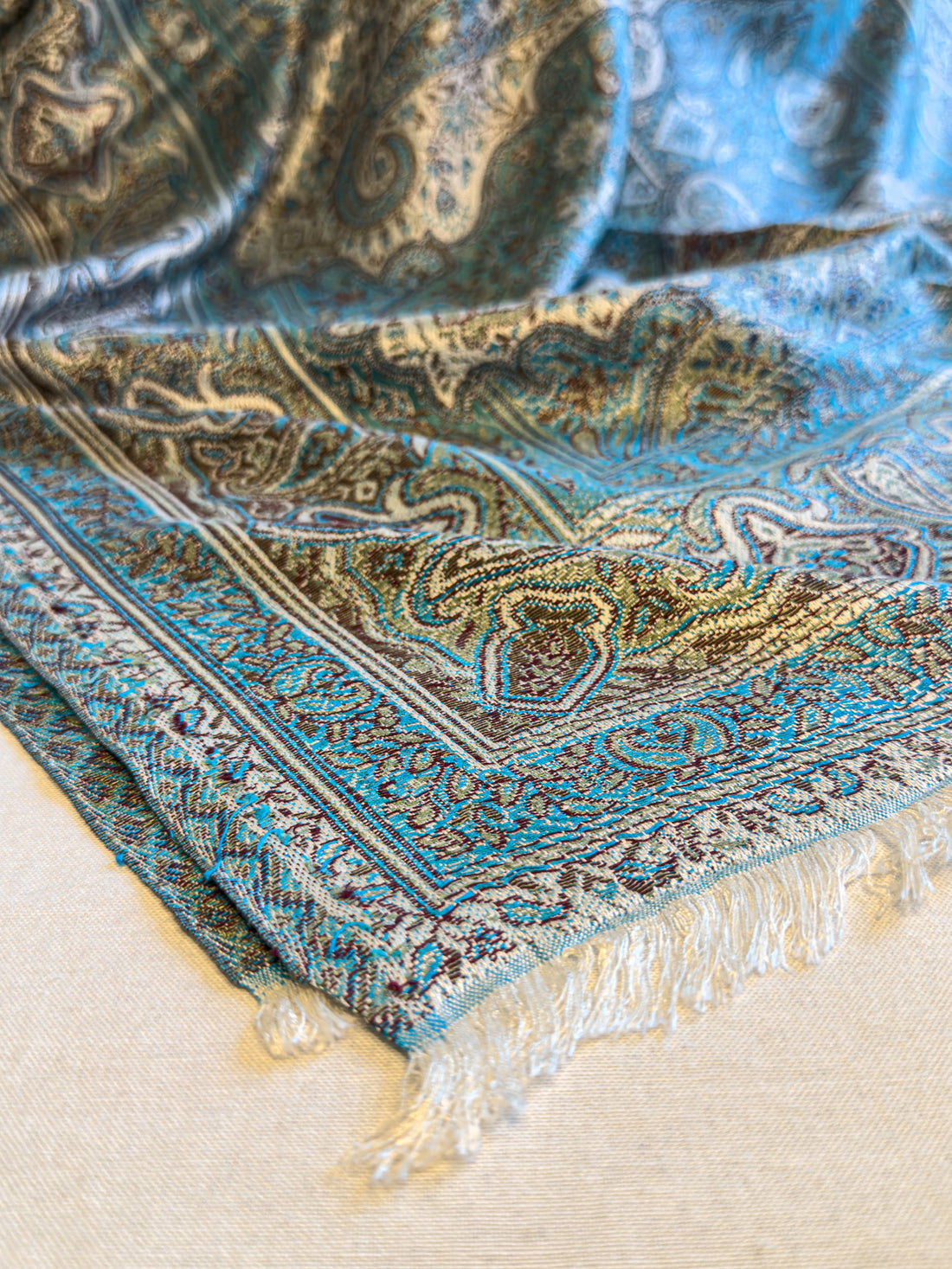 A graceful fusion of blues inspired by ocean mist. 100% Cashmere. This variation features hand-applied...