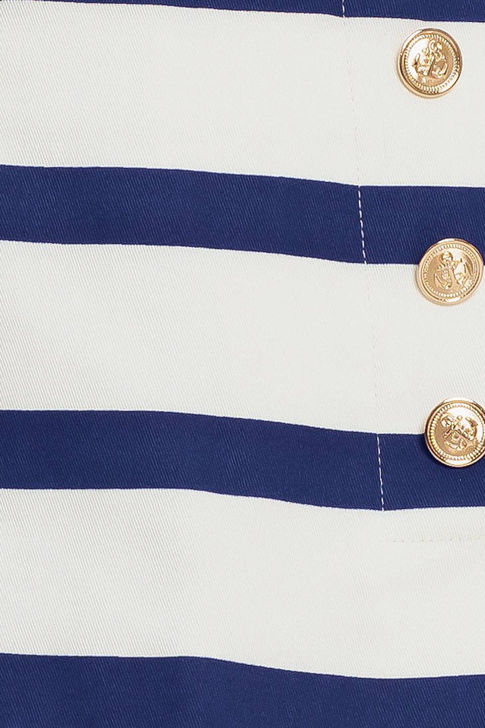 Elegant and effortlessly chic, the Marina Striped Shorts feature refined horizontal stripes that add a modern and sophisticated touch. The gold button details bring a subtle hint of luxury, elevating this timeless piece, 97% cotton and 3% spandex with 100% polyester lining; 14-inch length.